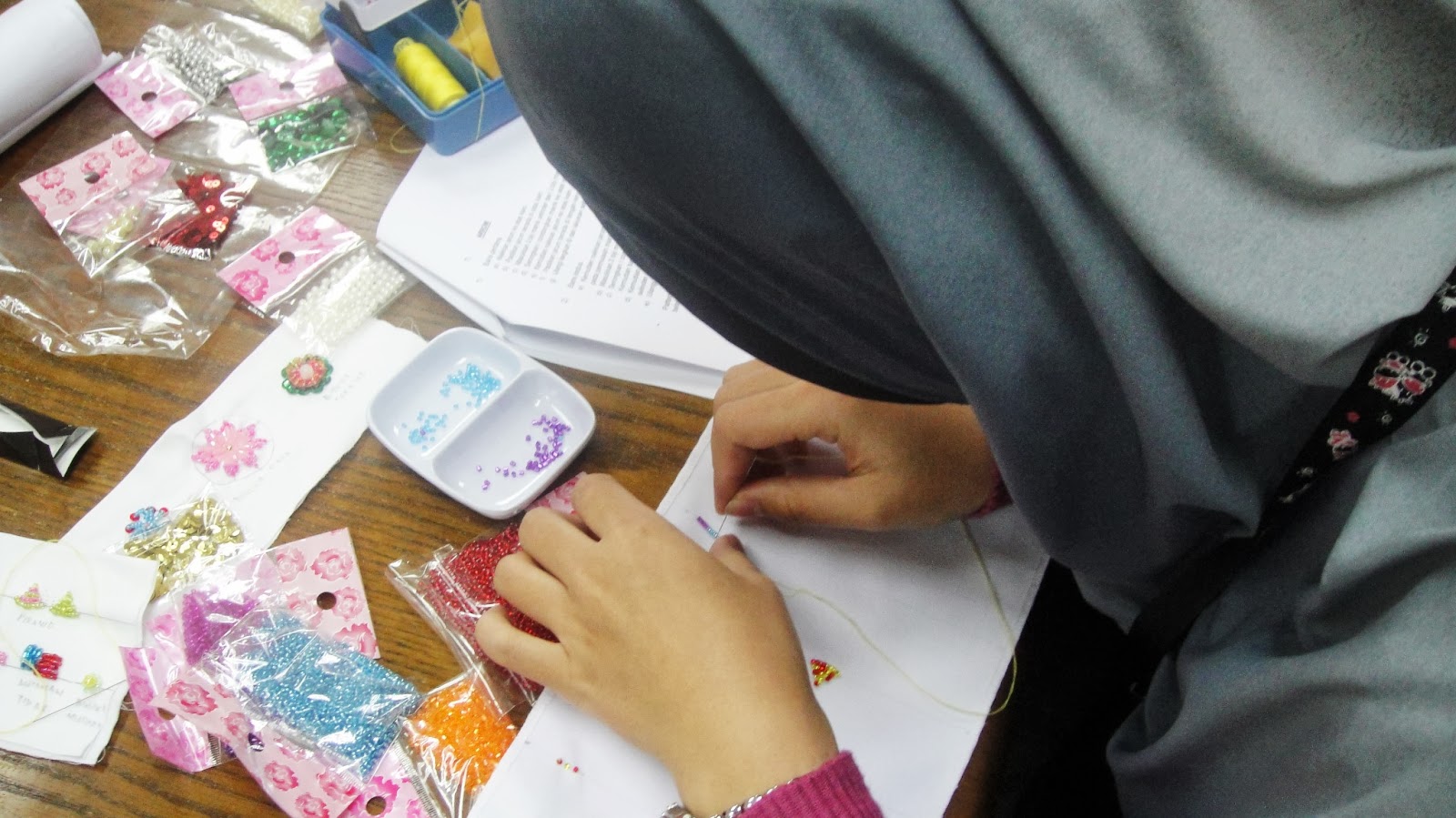 | Peserta bengkel manik mendengar taklimat cara untuk jahit manik |