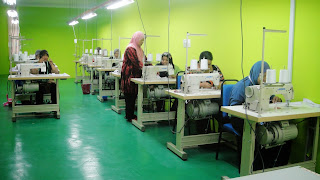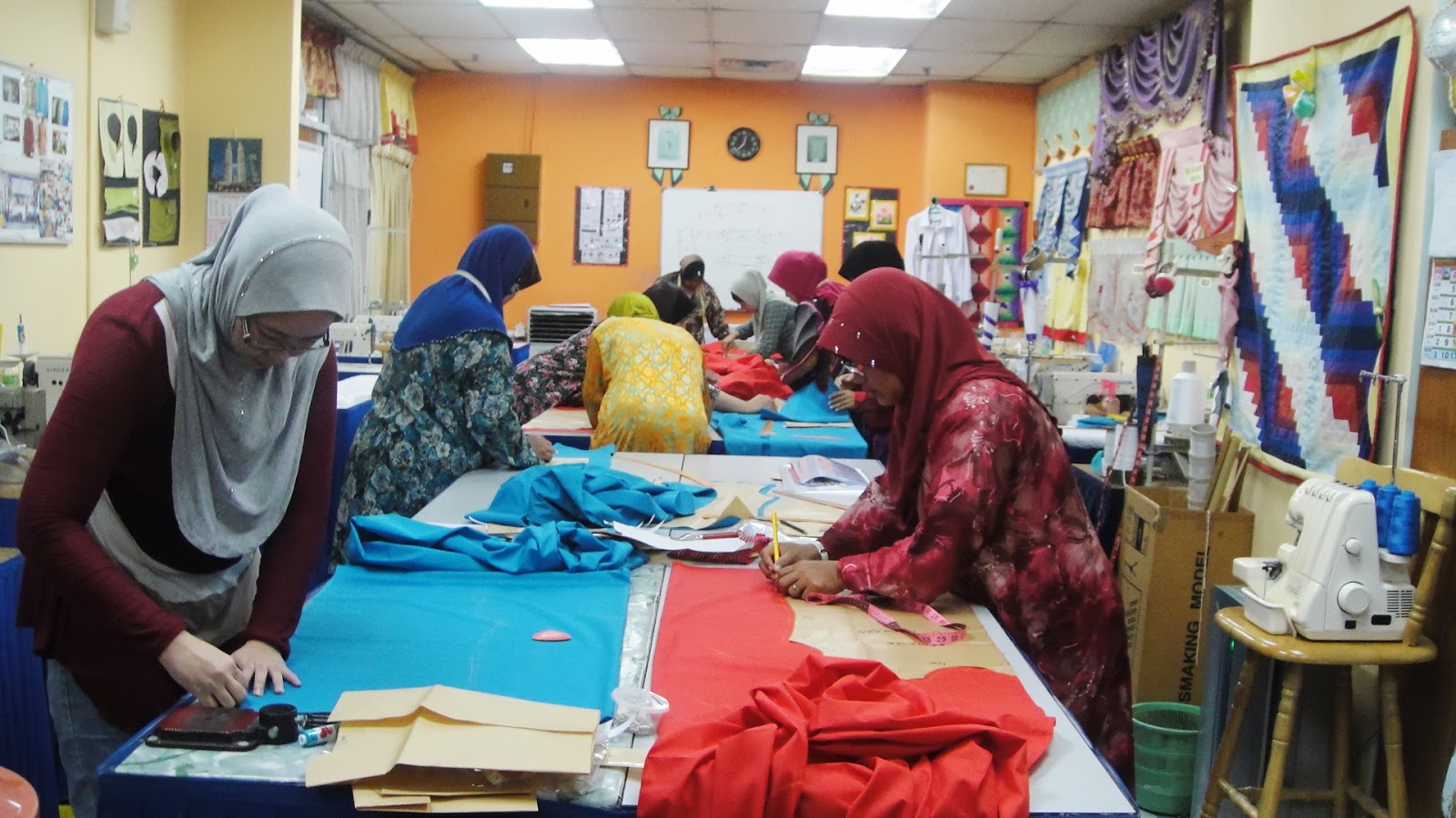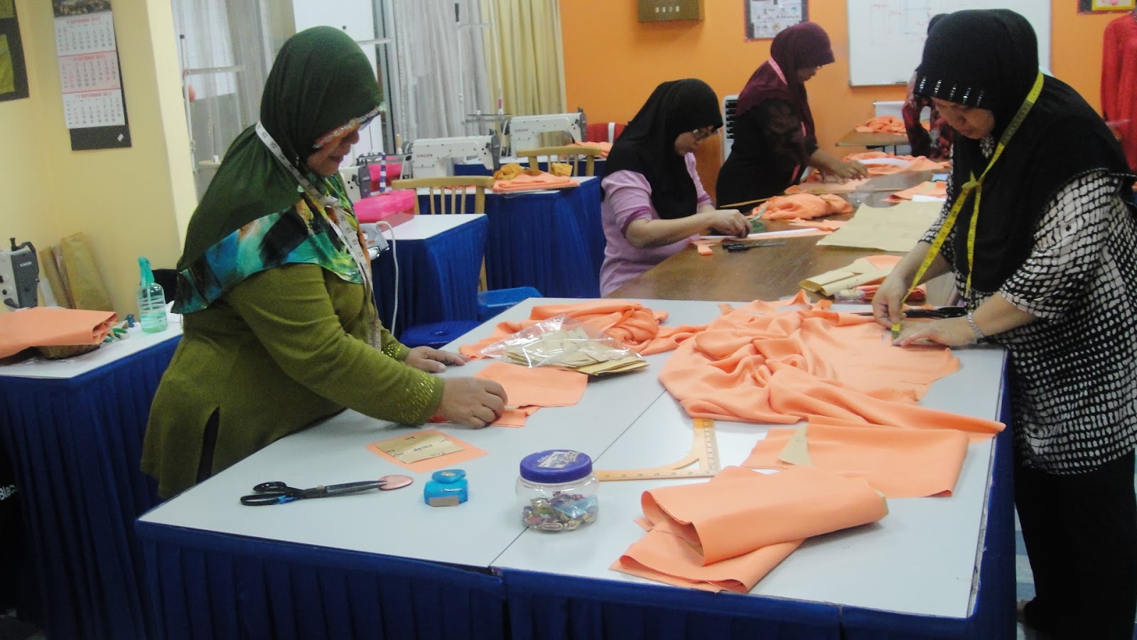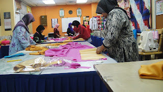 Peserta sedang memotong kain selepas membuat pola ukuran baju mereka.